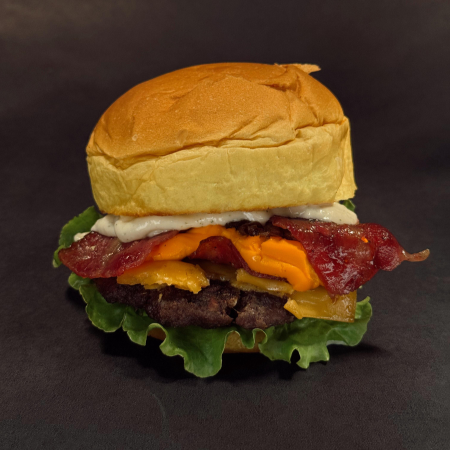 Pão brioche selado na manteiga, hamburguer bovino 120g, queijo cheddar, cebola caramelizada, cheddar cremoso, bacon, alface e tomate.