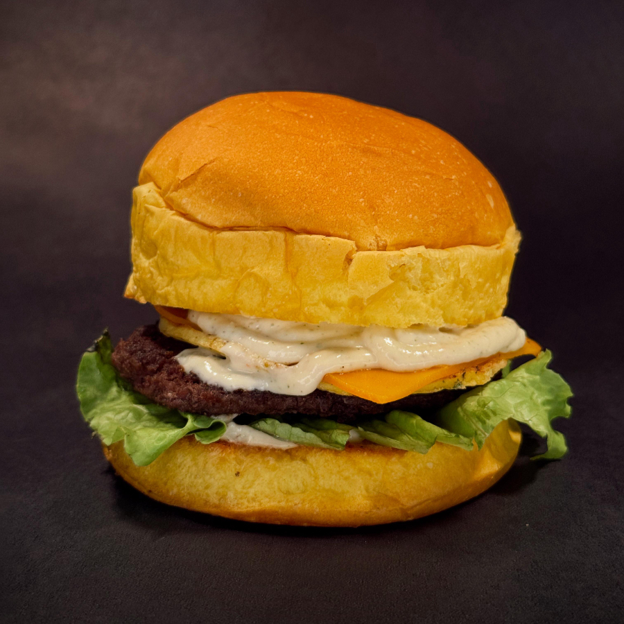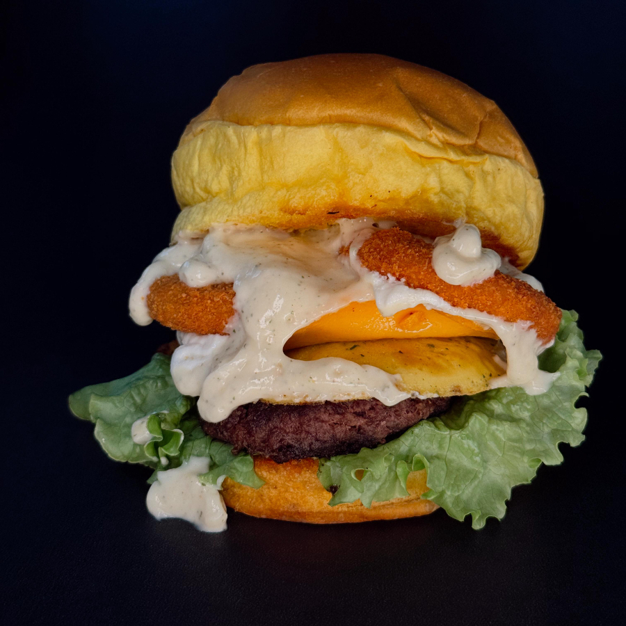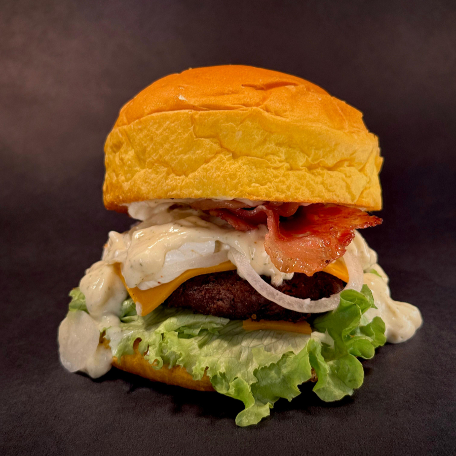 Pão brioche selado na manteiga, hamburguer bovino 120g, queijo prato, bacon, anel de cebola, ovo artesanal, molho especial, cream cheese, alface e tomate.