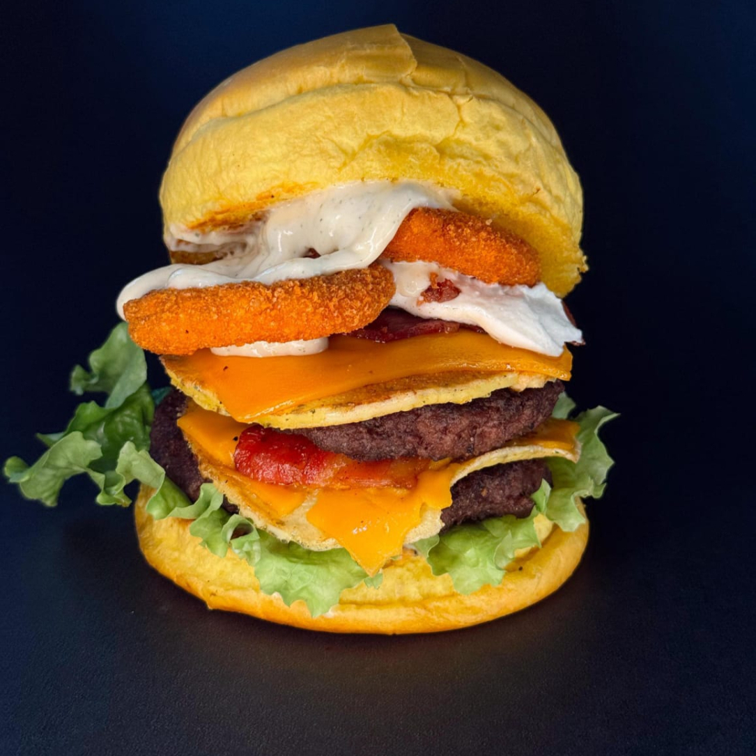 Pão brioche selado na manteiga, 2 hamburguer bovino 120g, duplo queijo prato, bacon, anel de cebola, ovo artesanal, molho especial, cream cheese, alface e tomate.