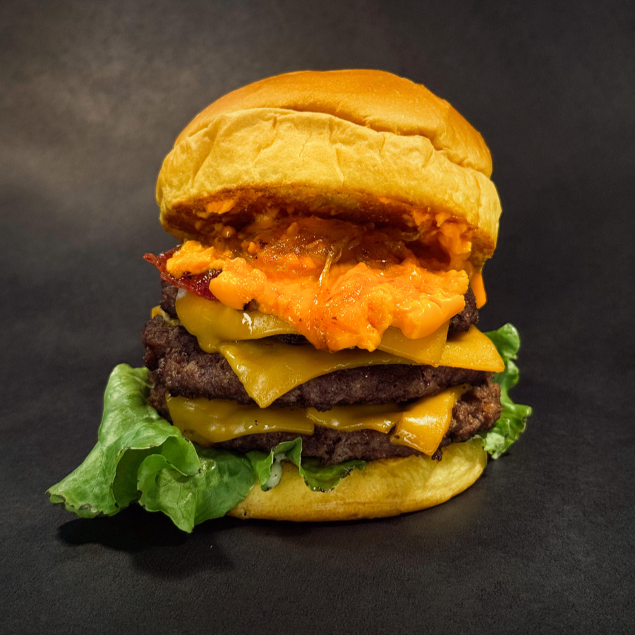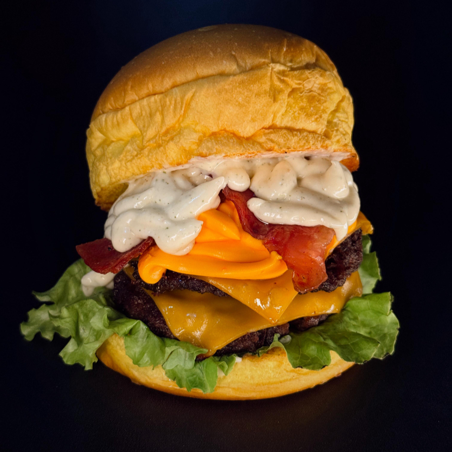 Pão brioche selado na manteiga, 2 hamburguer bovino 120g, duplo queijo cheddar, cebola caramelizada, cheddar cremoso, bacon, alface e tomate.