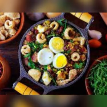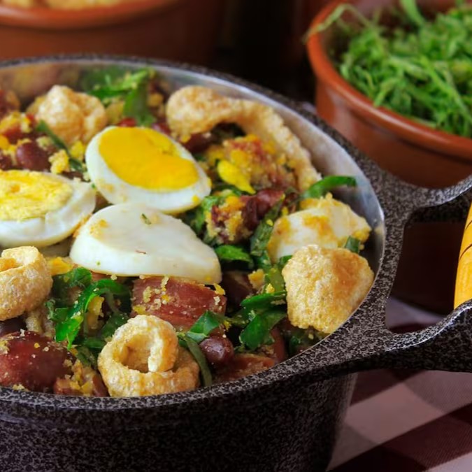 Marmita de Tropeiro Completo Acompanhado de Arroz Branco, Couve Crocante, Ovo frito e Bife de Pernil