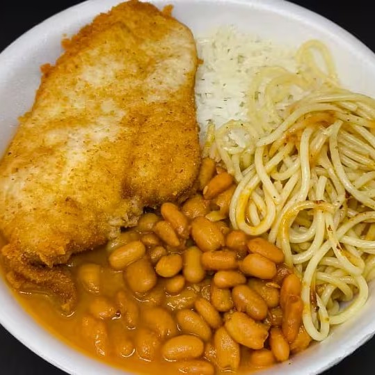 Bife de frango, Acompanhado De Arroz Branco, Feijão Carioca e batata frita.