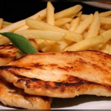 Delicioso filet de frango grelhado acompanhado de arroz branco feijão carioca e batata frita.