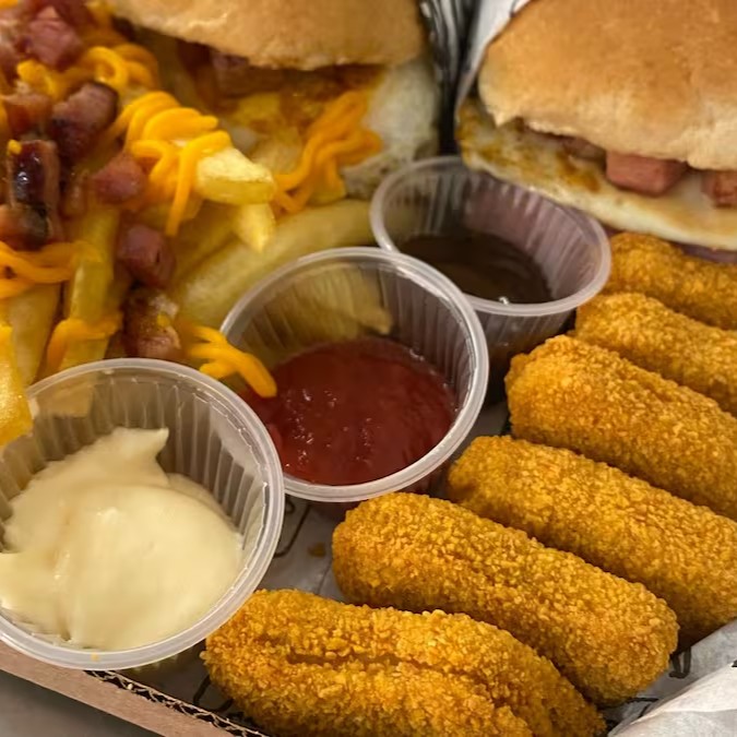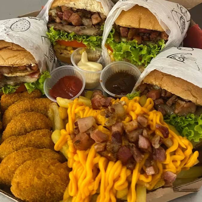 4 hamburgueres artesanais (pão com gergelim,blend bovino 100g, cremoso cheddar,maionese defumada,alface e tomate,anéis de cebola,nuggets de frango empanado,batata frita e molhos