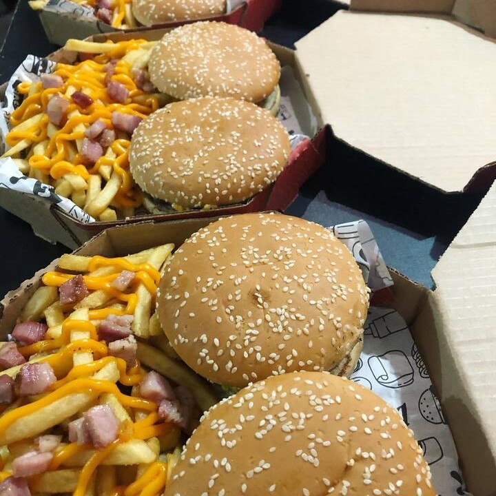 Dois hamburgueres artesanais (pão monaco,carne bovina artesanal 100g,cheddar,maionese defumada,alface e tomate) batata frita com cheddar e bacon