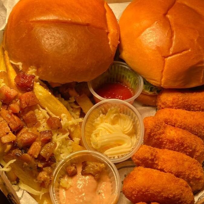 Dois hamburgueres artesanais (pão de brioche,carne artesanal 100g, cheddar,maionese defumada, bacon,alface e tomate) nuggets de frango empanado,batata frita com queijo e bacon+ molhos