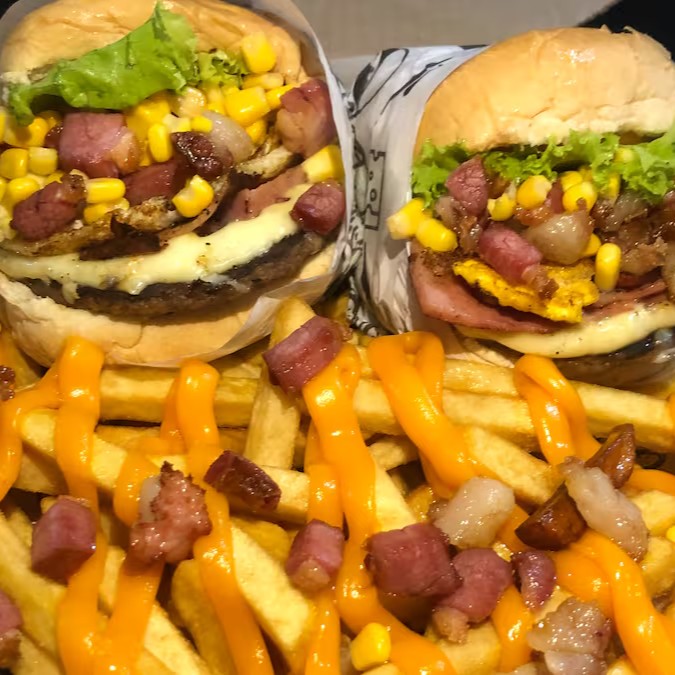 Dois x-egg bacon (pão,carne de hamburguer,presunto mussarela,bacon,milho,alface e tomate) Batata frita com cheddar e bacon