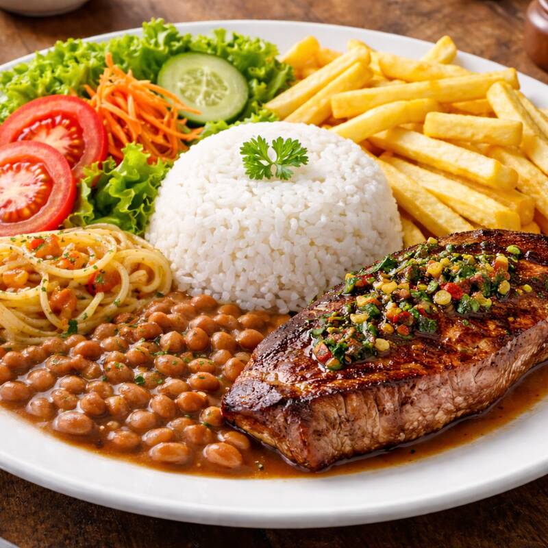 Arroz,feijão carioca,macarrão,batata frita,salada e bife de picanha