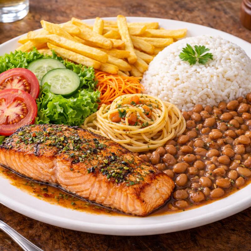Arroz,feijão carioca,macarrão,batata frita,salada e salmão