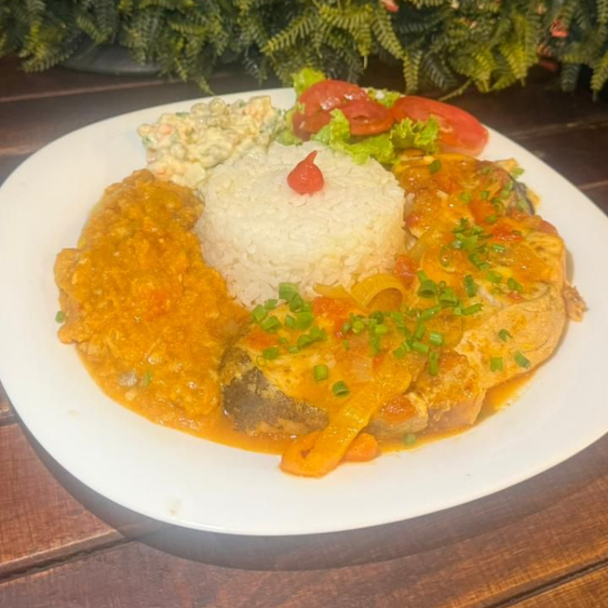 Arroz branco,feijão carioca,moqueca de surubim e pirão