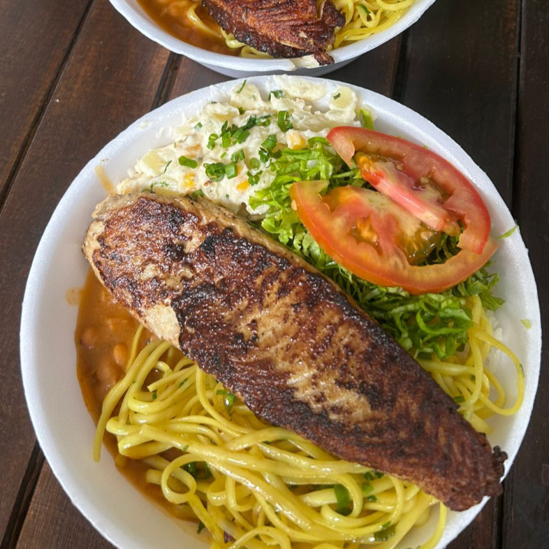Arroz branco, feijão carioca, macarrão, batata frita, salada e filé de tilápia