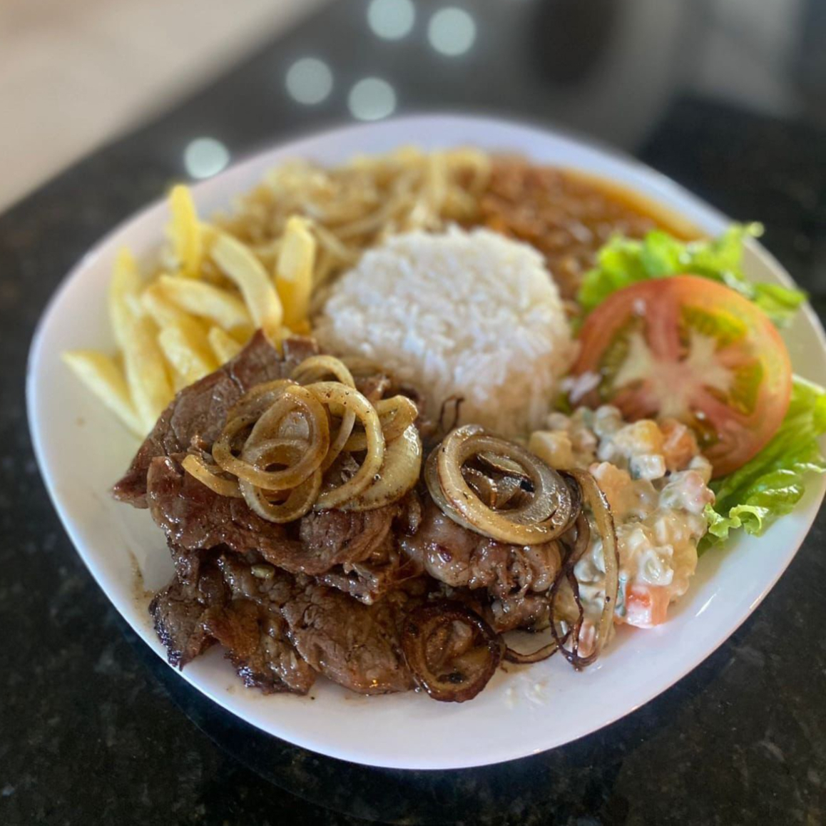 Arroz,feijão carioca,macarrão,batata frita,salada e bife de contra filé