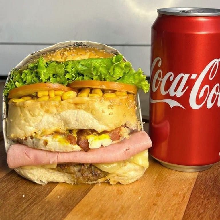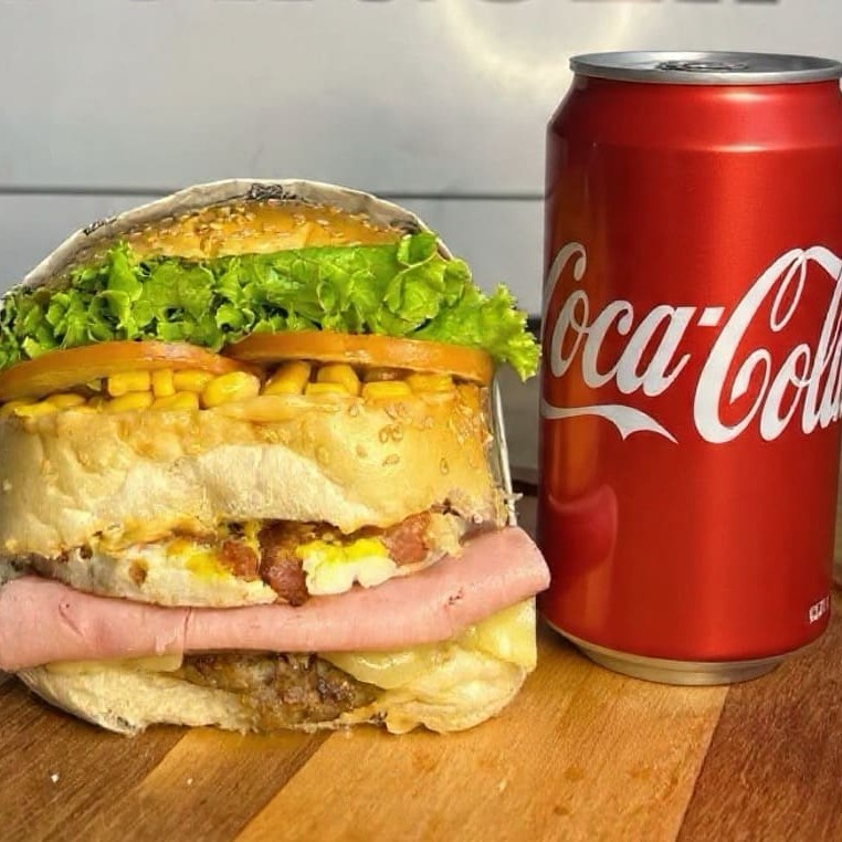 Pão , Picanha 120g , Milho , ovo , bacon , mussarela, presunto, salada e molho .Acompanhado com Coca-Cola .