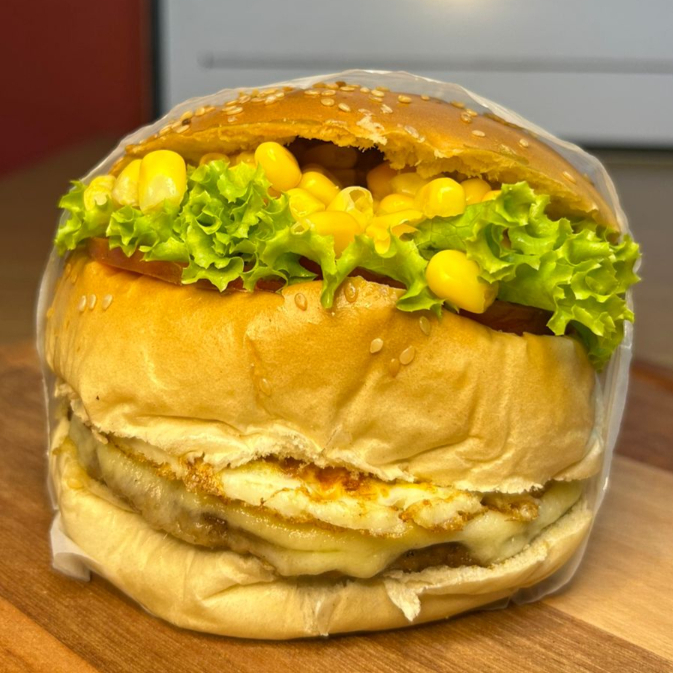 X-Salada: Pão tradicional, (Carne 56g) in natura, Ovo estrelado, queijo mussarela, milho e salada de alface e tomate.