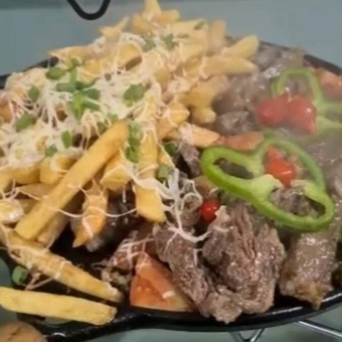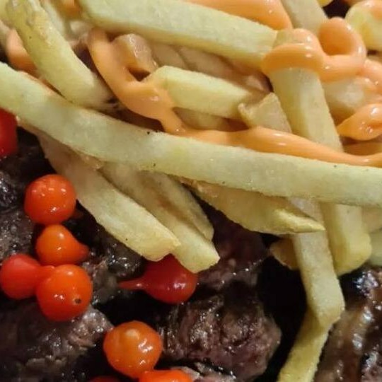 400 grs de carne,400 grs de batata frita com bastante mussarela flambada