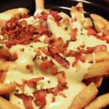 400 grs de batata frita, regada com bacon e mussarela flambada