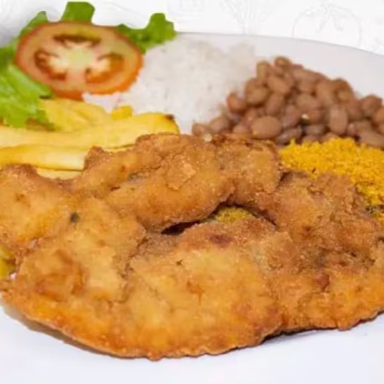 Delicioso file de frango empanado , acompanhado de arroz , feijão temperado salada fresca , batata frita crocante