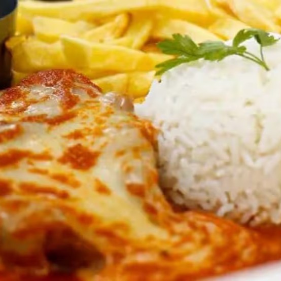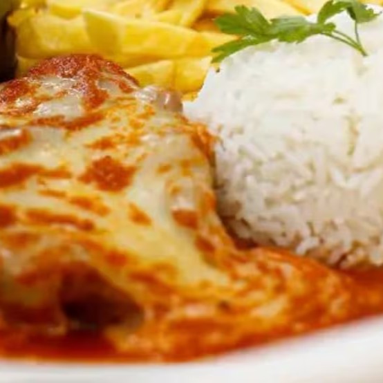 Delicioso filé de frango a parmegiana como molho de tomate artesanal e muçarela gratinada , acompanhada de arroz branco