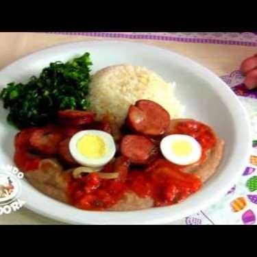 Arroz branco soltinho , com tutu bem temperado e cremoso, acompanhado de linguiça calabresa acebolada e salada