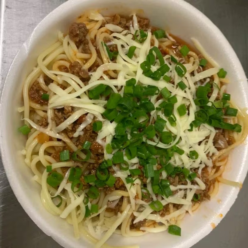 Espaguete abololhesa, queijo Mussarela e cheiro verde.