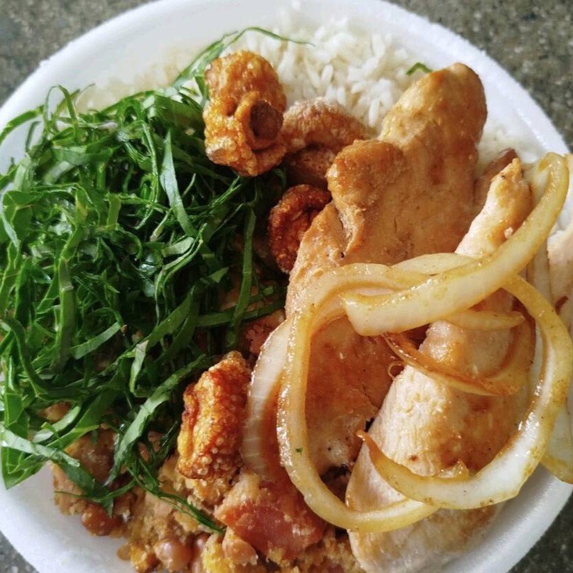 Arroz feijão tropeiro bife de frango couve e torresmo