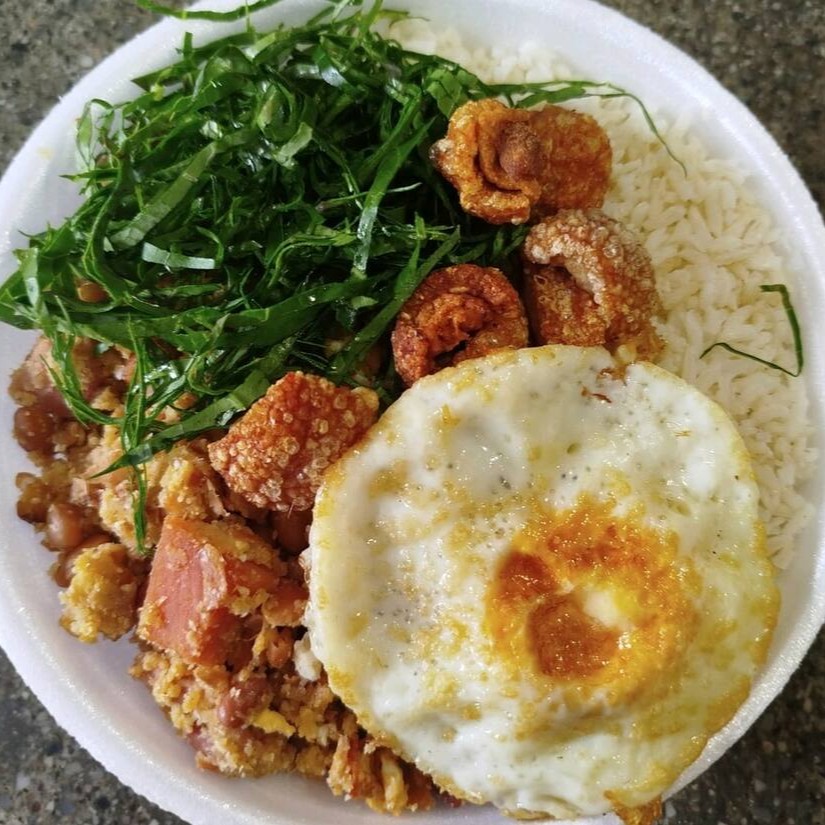 Feijão tropeiro (feijão, bacon, linguiça e 2 ovos), couve e torresmo.