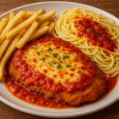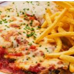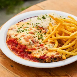 Frango á parmegiana com molho caseiro artesanal, arroz branco e fritas.