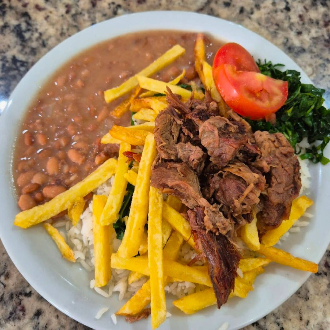 Arroz branco, feijão carioca, batata frita, tomate, couve e costela assada (100g sem osso).