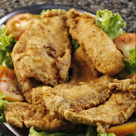 Delicioso filé de tilápia frito levemente empanado. Pedido a cada 100 gramas,(a tilapia e pesado cru. Quando frito , ocorre a perda de aproximadamente 20% do peso inicial .).