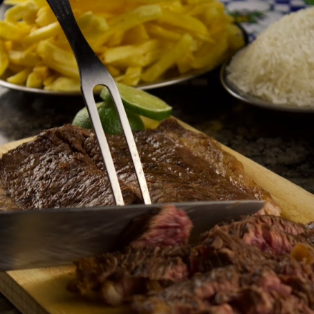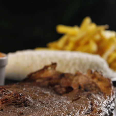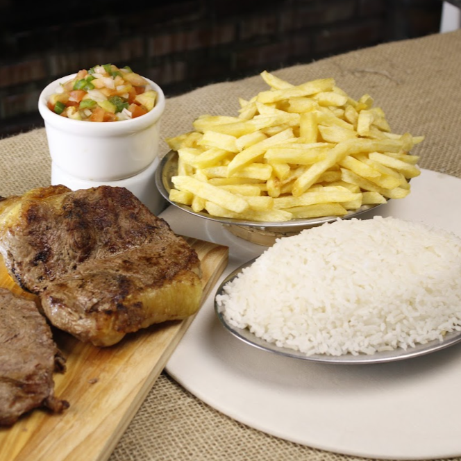 500g de Contra Filé, arroz, fritas e vinagrete. Refeição serve aproximadamente 3 pessoas.