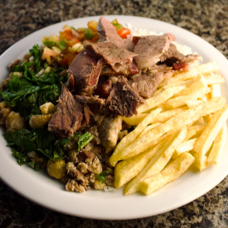 Arroz branco, tropeiro, couve, batata frita, costela assada (100g sem osso) e tomate.