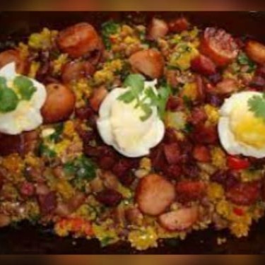 Feijão Tropeiro Bacon E Calabresa Com Frango Assado para 2,Toresmo,2 Ovos Fritos e Batata Fritas.