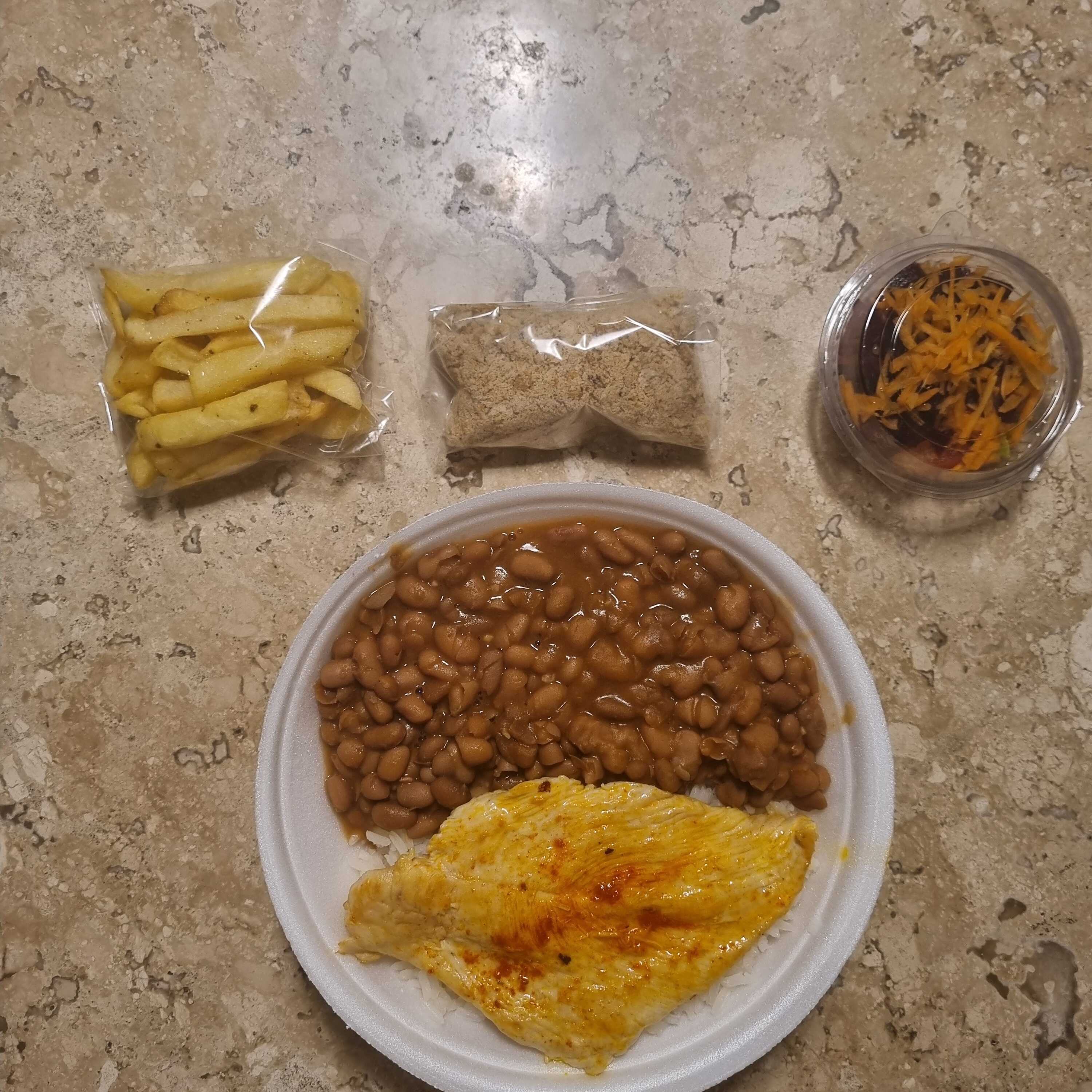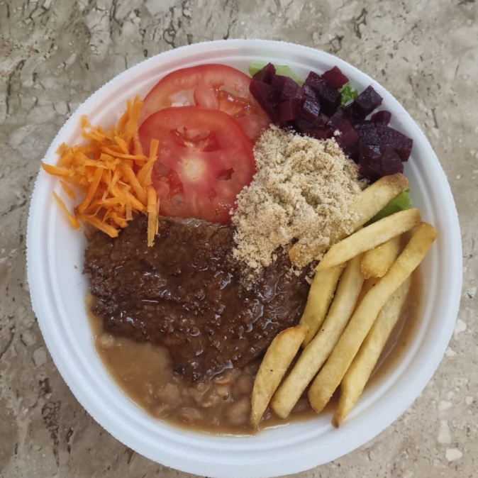 Arroz, feijão, batata frita, farofa e salada (alface, tomate, beterraba)