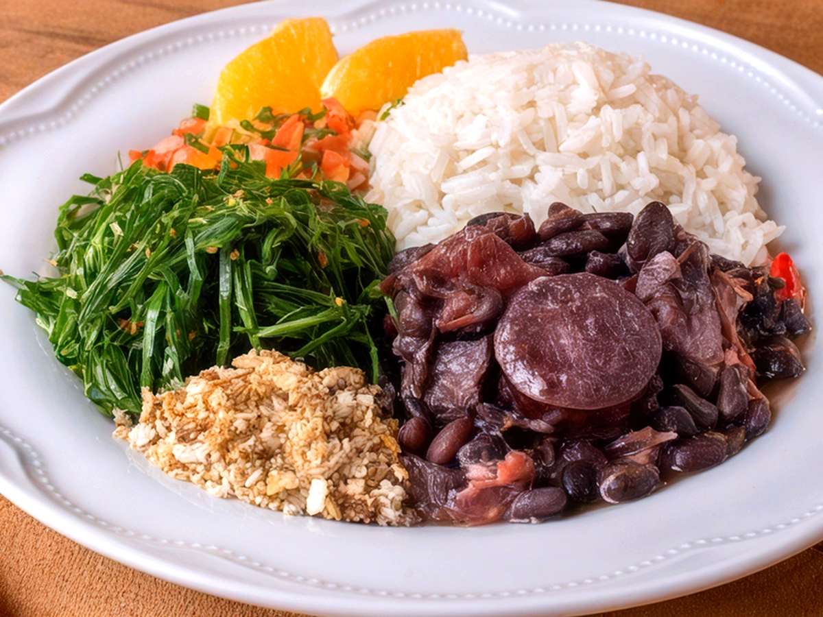 Arroz, feijão, salada, batata, farofa e salada (alface, tomate, beterraba)