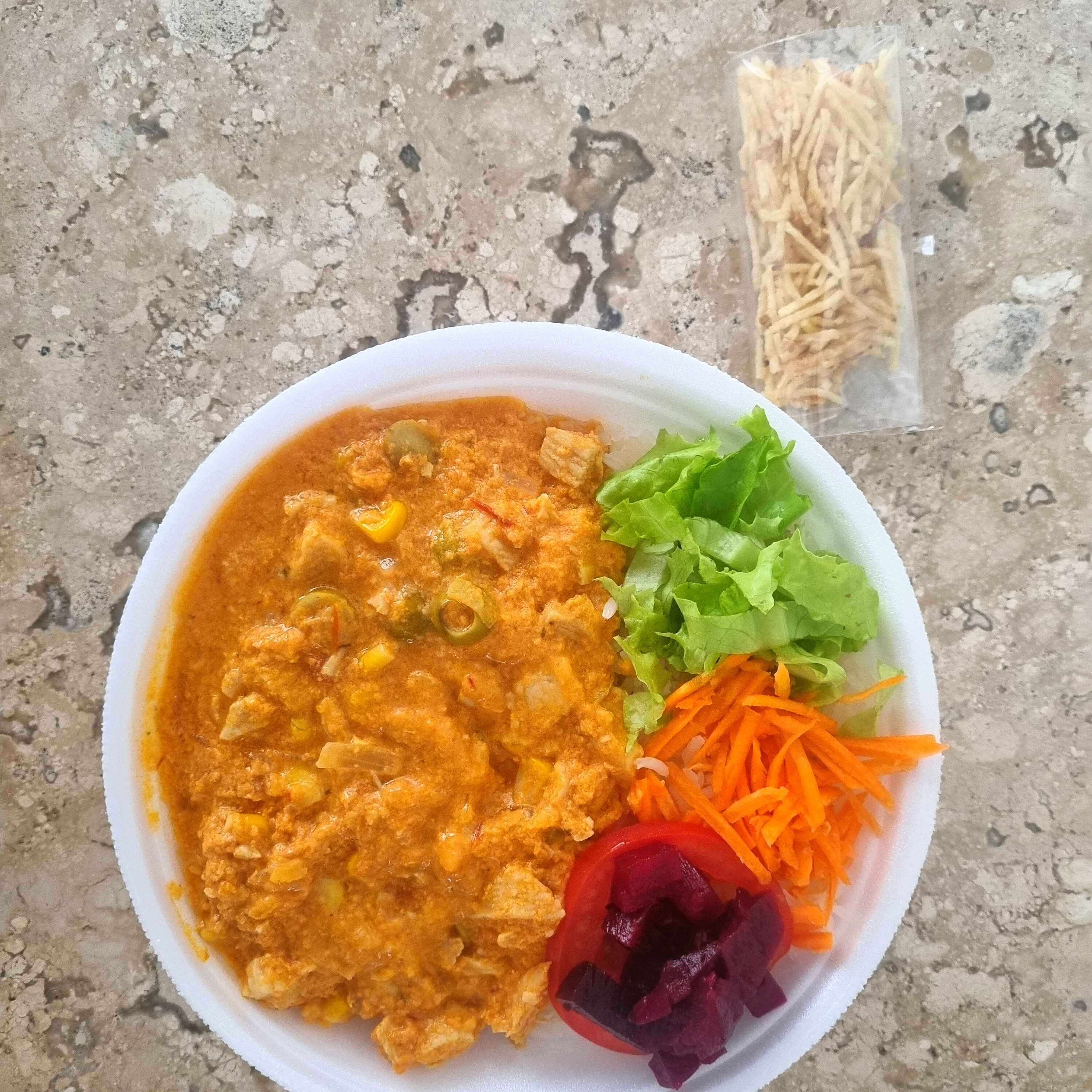 Arroz, batata palha e salada (alface, tomate, beterraba)