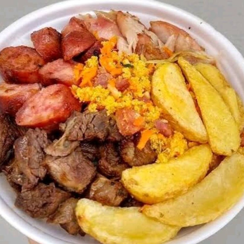 arroz neve, tropeiro, batata frita , legumes, alcatra e medalhao