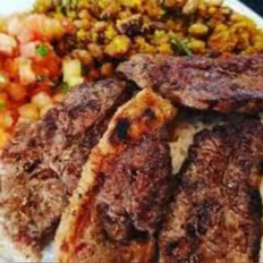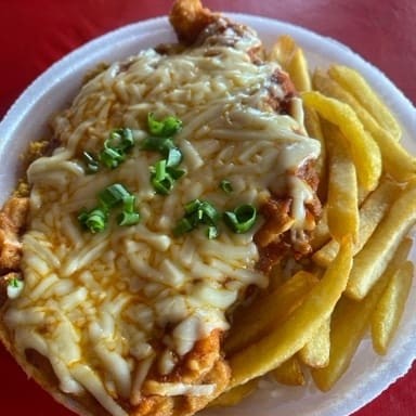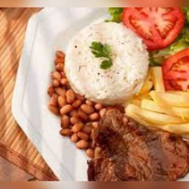 Arroz branco , feião bem temperado, uma generosa porção de batata frita , uma delicioso salpicão , churrasco de alcatra derretido com queijo derretido.