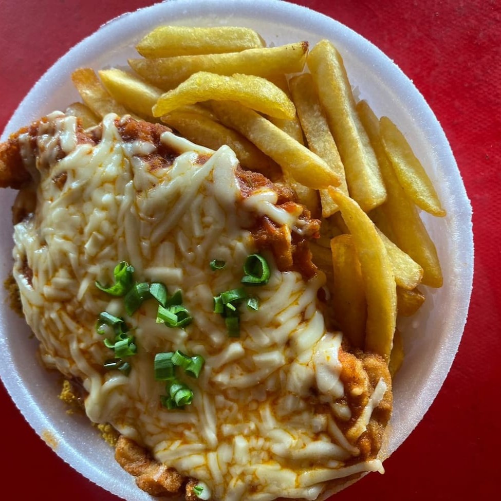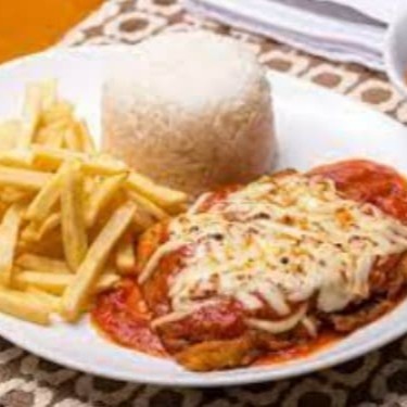 Um belo filé de frango empanado crocante, com um delicioso molho de tomate, coberto com queijo mussarela. Acompanha: Arroz Branco Soltinho, Batata Frita, Farofa caseira.