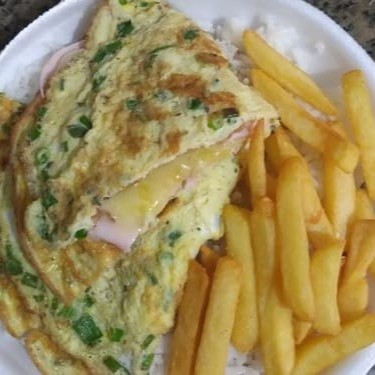 Arroz branco , feião bem temperado, uma generosa porçao de batata frita , um omelete saboroso. 500 gramas 500 gramas