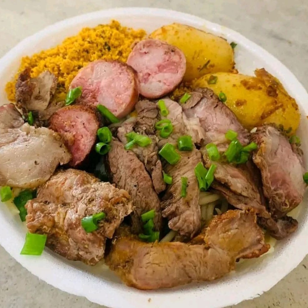 Arroz branco , feião bem temperado, uma deliciosa farofa, verduras afogada, 100 gramas de churrasco de pernil e linguiça,