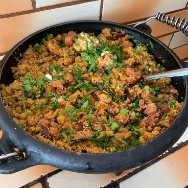 Arroz Tropeiro, couve, torresmo, churasco misto ,ovo e salada