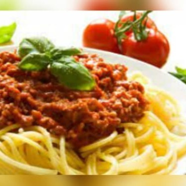 Espaguete bolonhesa ao molho de tomate com carne moída , com queijo e mozzarella e cheiro verde, pequeno