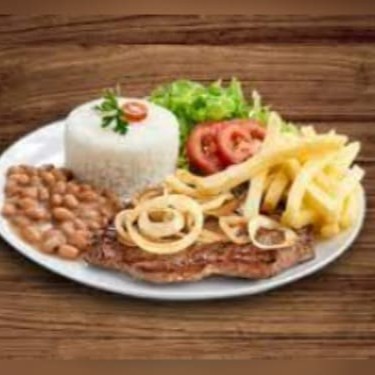 Arroz branco , feião bem temperado, uma generosa porção de batata frita , verdura afogada a moda casa casa , farofa bem temperada. Um delicioso bife de porco suculento , pequeno