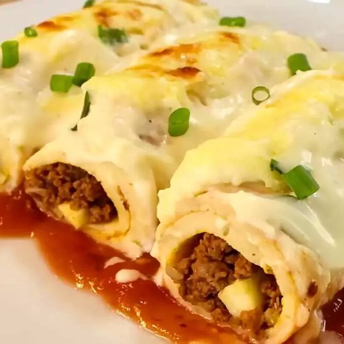 Panquecas recheada com frango e requeijão, com molho de tomate e queijo mussarella. Acompanha Arroz e Fritas.
