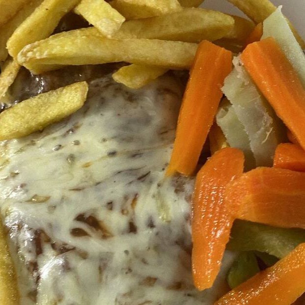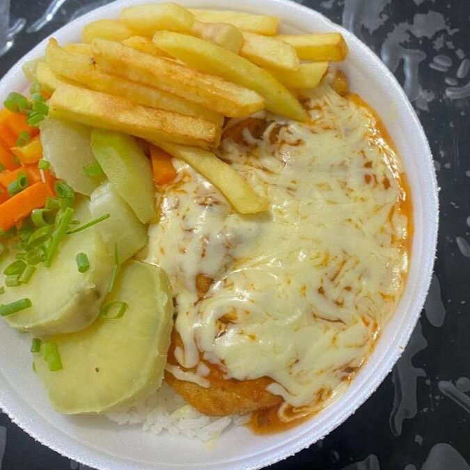 Filé a Parmegiana acompanha: Arroz, Batata frita e Mix de legumes.