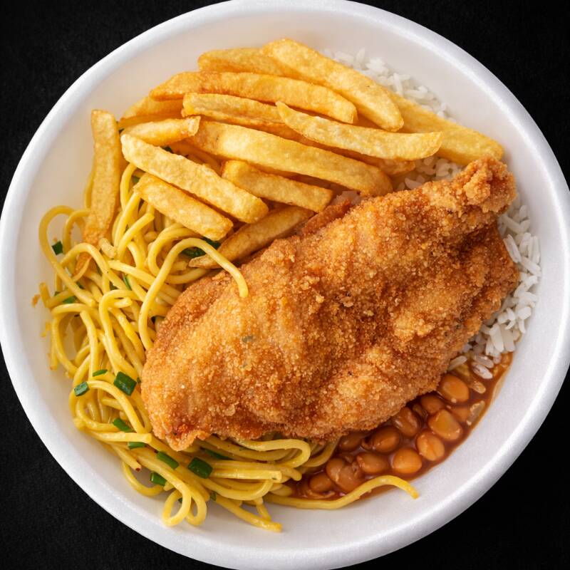 Marmita com delicioso frango empanado acompanhado de arroz branco soltinho, feijão de caldo, Espaguete ao alho e óleo, nossa famosa batata chips frita e salada . (Marmita indicada para 01 pessoa aprox.500g)