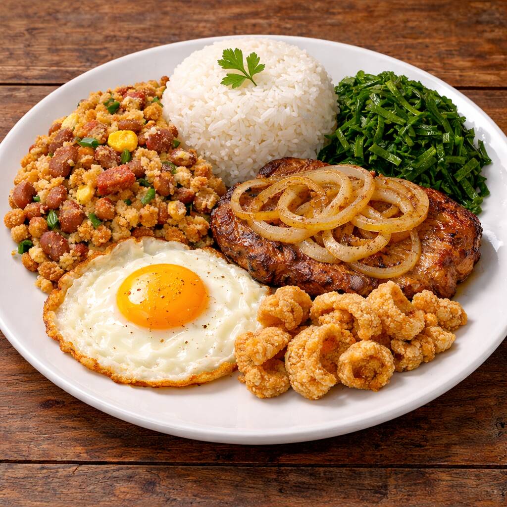 Marmita com delicioso feijão tropeiro feito com pedaços de bacon e calabresa, arroz branco soltinho, couve fininha ao alho, pernil acebolado, 01 ovo frito, torresmo separado sequinho.(Marmita indicada para 01 pessoa aprox.500g)
