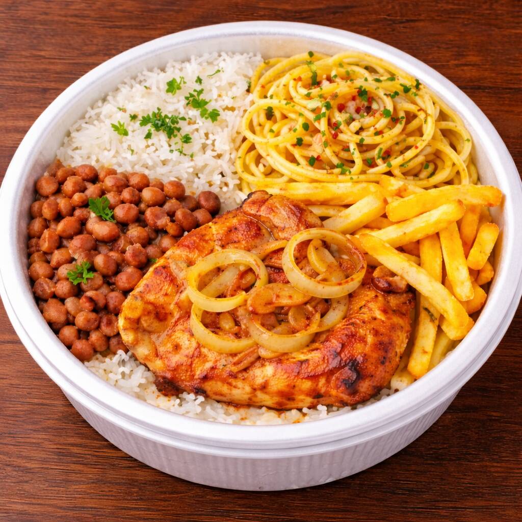 Marmita com delicioso arroz branco soltinho, feijão de caldo, espaguete ao alho e óleo, batata frita, 01 carne a sua escolha, saladinha de alface, tomate e cenoura. (Marmita indicada para 01 pessoa aprox.500g)