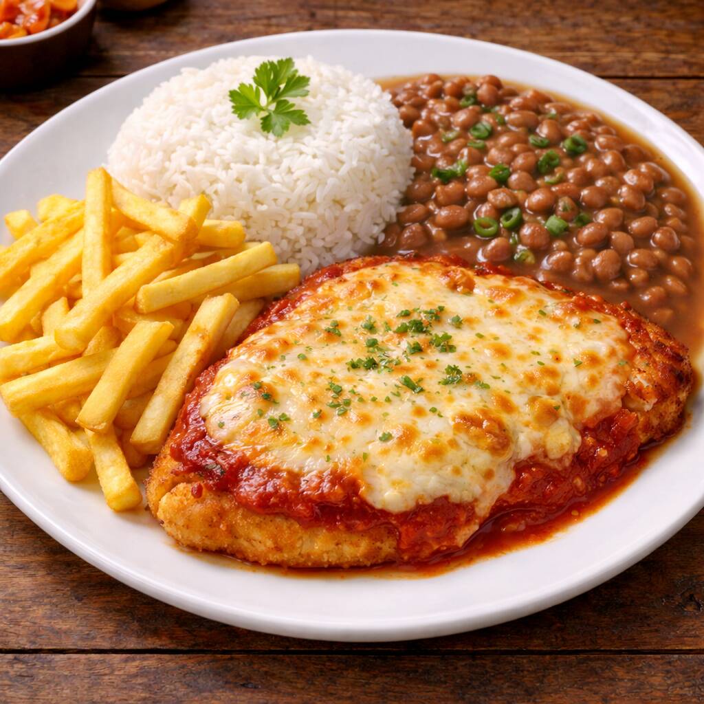 Marmita com delicioso filé de frango empanado, (Coberto com molho de tomates e queijo muçarela) acompanhado de arroz branco, feijão de caldo, nossa famosa batata chips frita, saladinha de alface, tomate e cenoura. (Marmita indicada para 01 pessoa aprox.500g) #parmegiana #parmegiana parmegiana