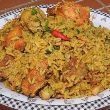 Deliciosa galinhada Divina composta com: arroz, frango, calabresa, bacon, cebola, azeitona, pimenta biquinho e cheiro verde